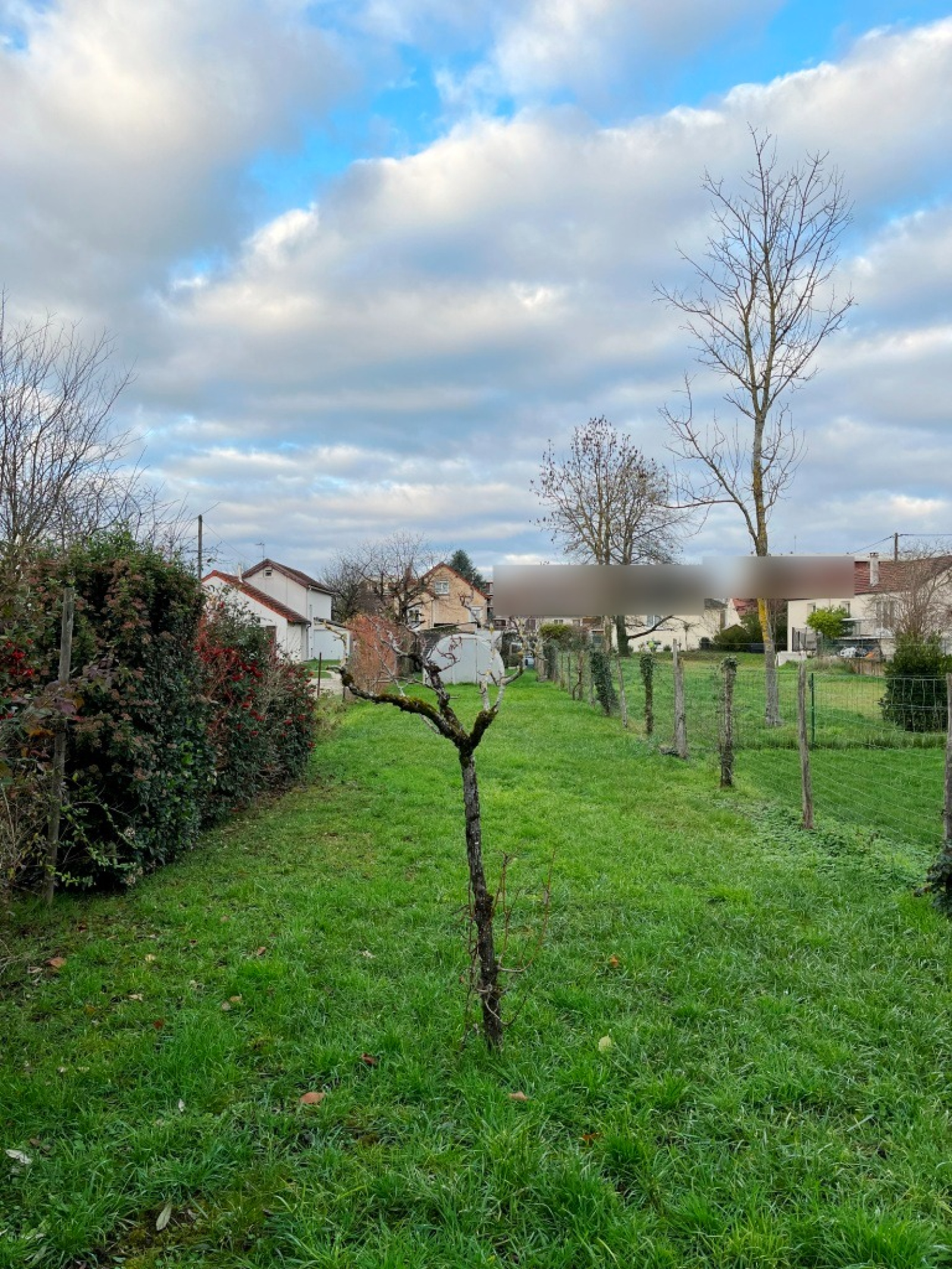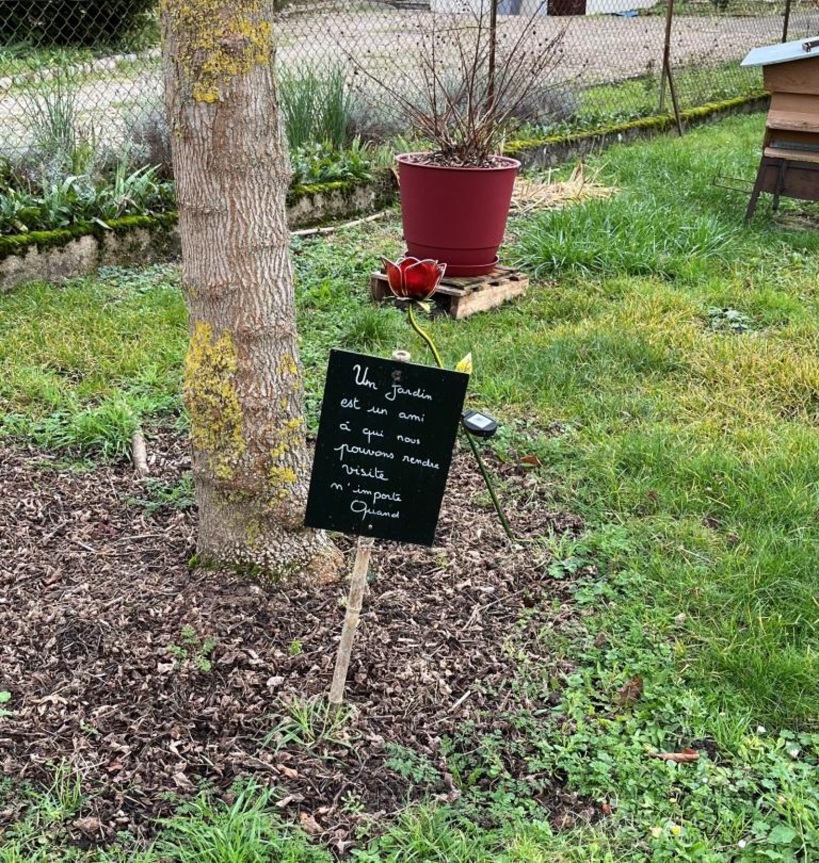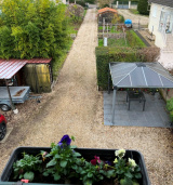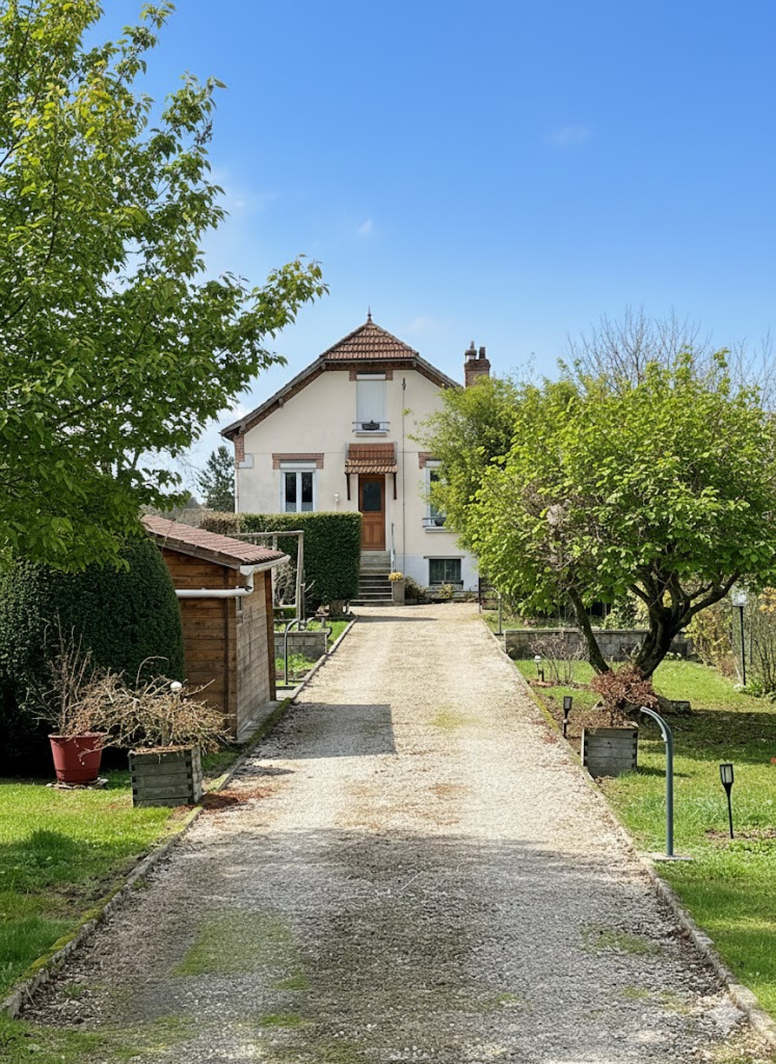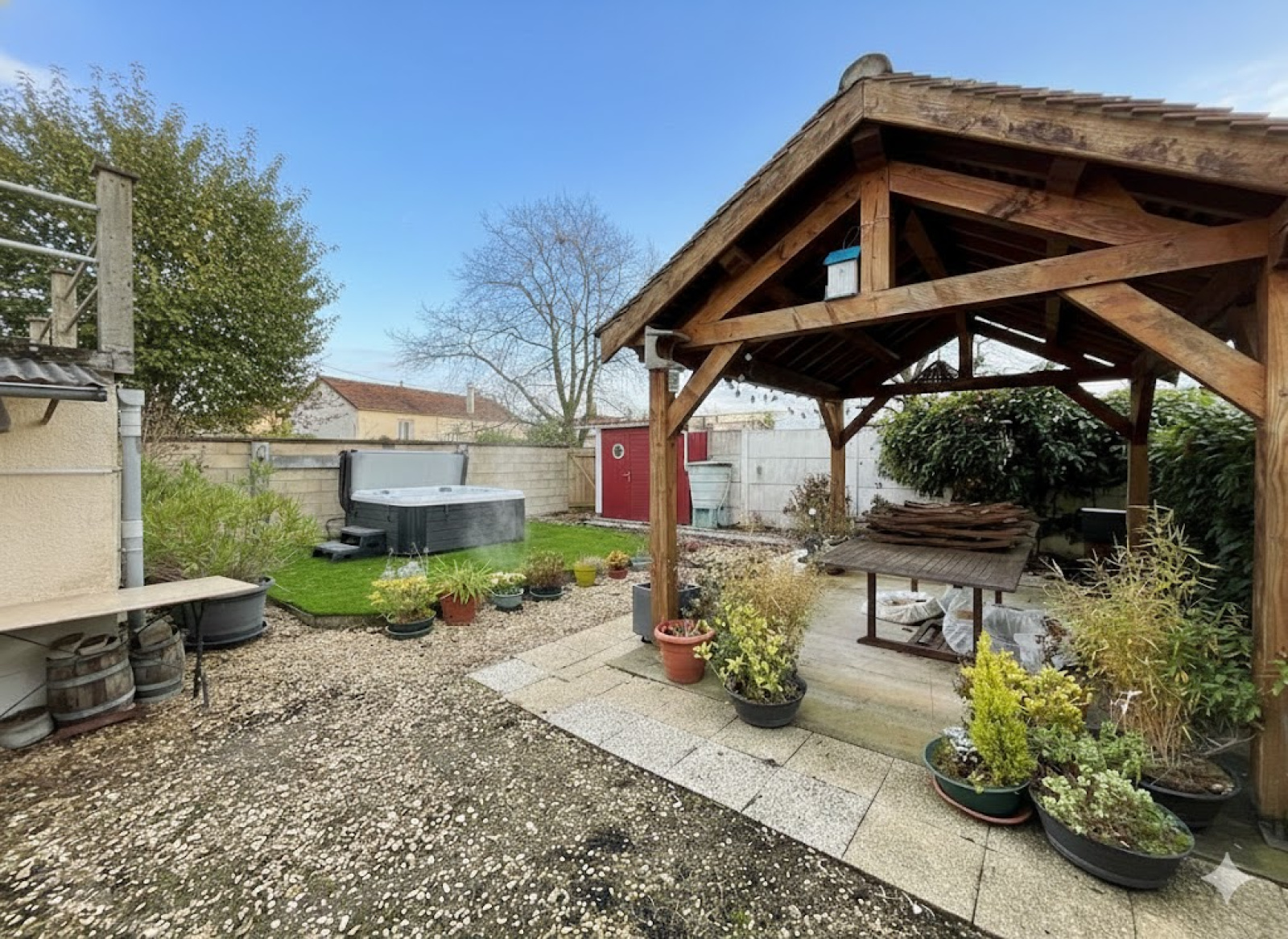 Jardin d'accès avec chalet, faux puits (mais vrai pompe piquet) pergola, bûcher, et côté Sud de la maison, espace sans vis à vis abritant un SPA, un auvent et un verger.