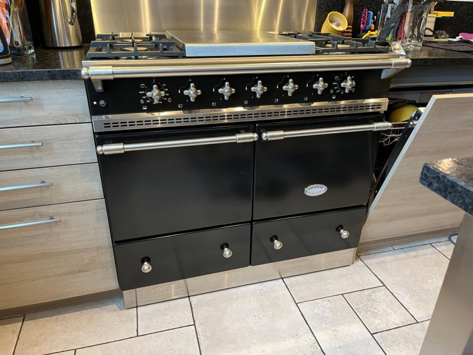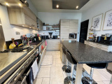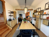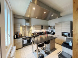 Un escalier dessert l'entrée de la maison. Apparaît une très belle pièce de vie comprenant, sur le côté droit, un salon salle à manger parqueté de chêne de 31m² avec cheminée insert, (mobilier sur mesure fluide et clair fait de métal et de bois, en option), Une belle cuisine moderne, très fonctionnelle, avec îlot central et crédence en granit. Piano de cuisine Lacanche à 5 feux et double four pour les passionnés, hotte Novy...