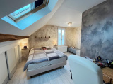 Une chambre chaleureuse, dans les tons sable, munie d'un grand placard de rangement, une salle de bains avec douche et WC.