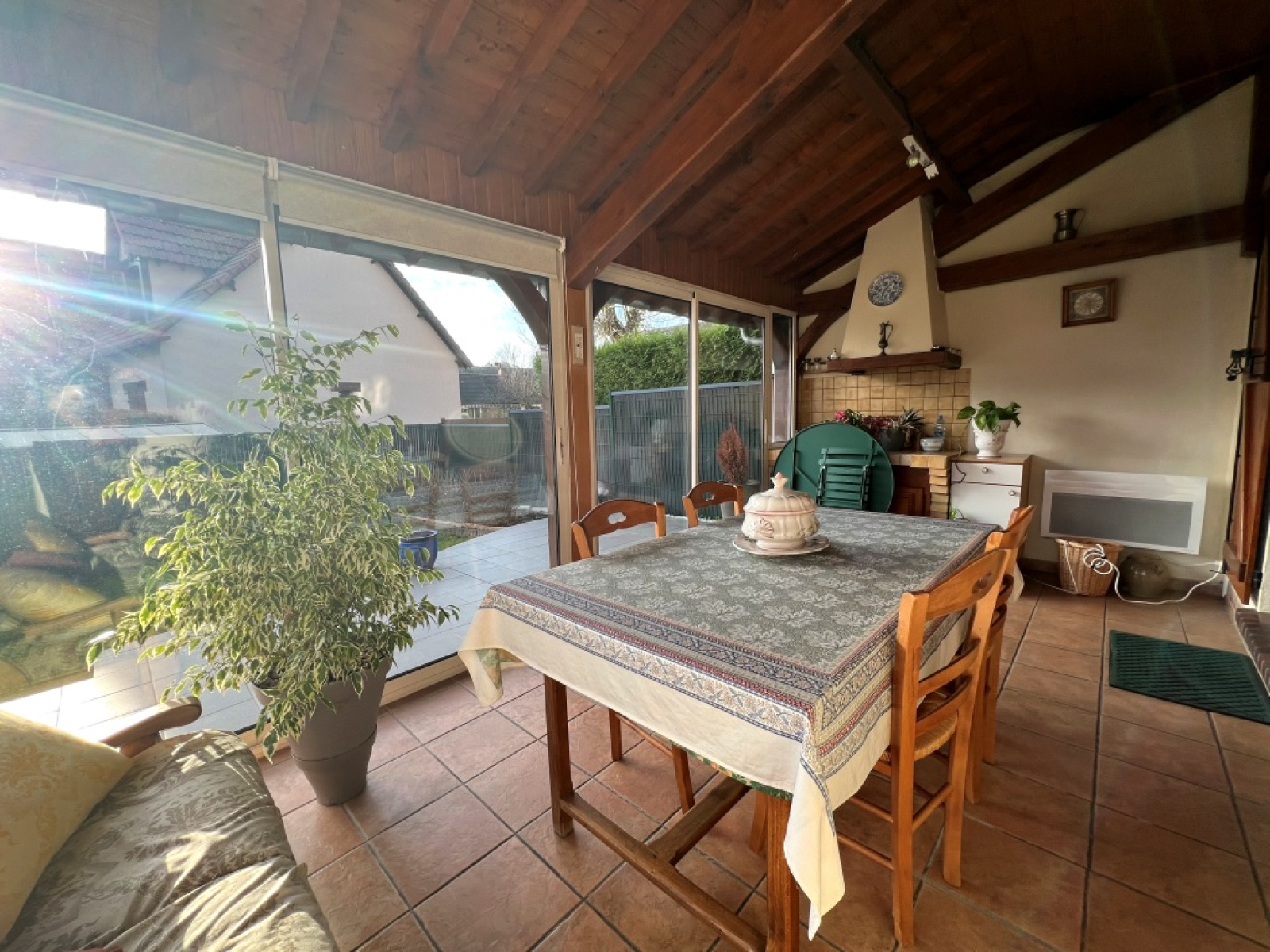 Le rez-de-chaussée se compose d'un séjour salon de 38m2 avec sa cheminée ouvrant sur une véranda chauffée, une cuisine indépendante aménagée et équipée, une chambre, salle d'eau et wc avec lave-mains.