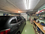 Sous-sol complet compartimenté en garage de 32m2 avec porte automatique, chaufferie et cellier.