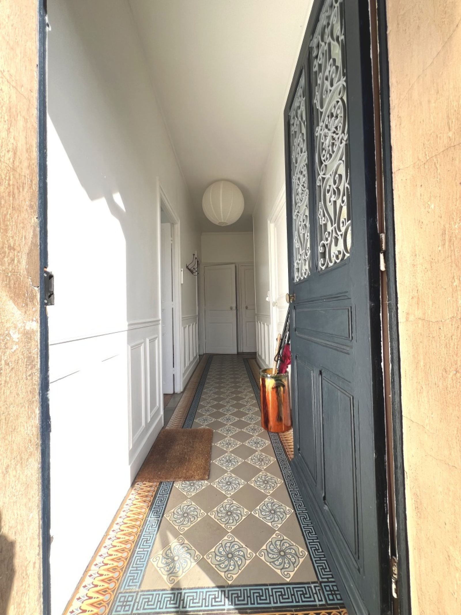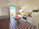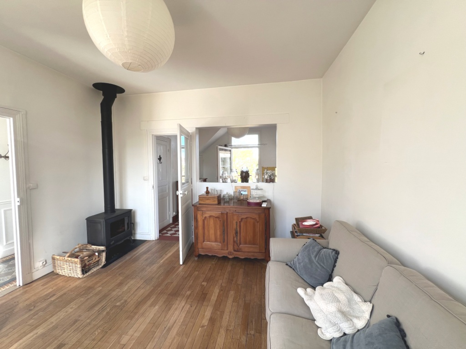 Aptès deux marches, une belle entrée en carreaux de ciment dessert un séjour salon lumineux avec son poêle à bois, une cuisine aménégée et équipée, deux chambres parquétées et une salle d'eau avec wc.