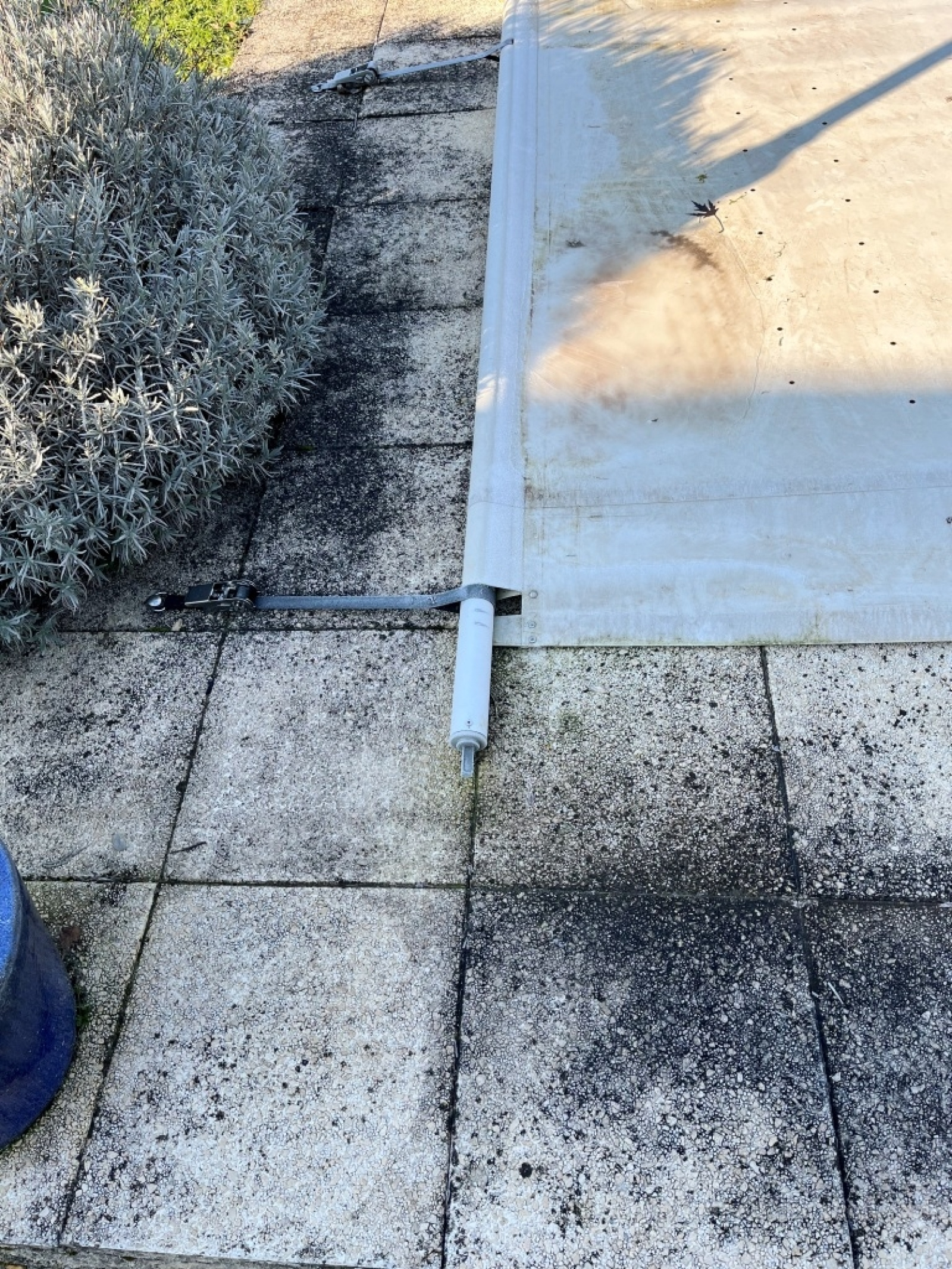 Entre les 2 habitations, une allée dessert la piscine de 10m*5.50m, sécurisée par une couverture à barres avec liner et pompe de 2023.