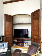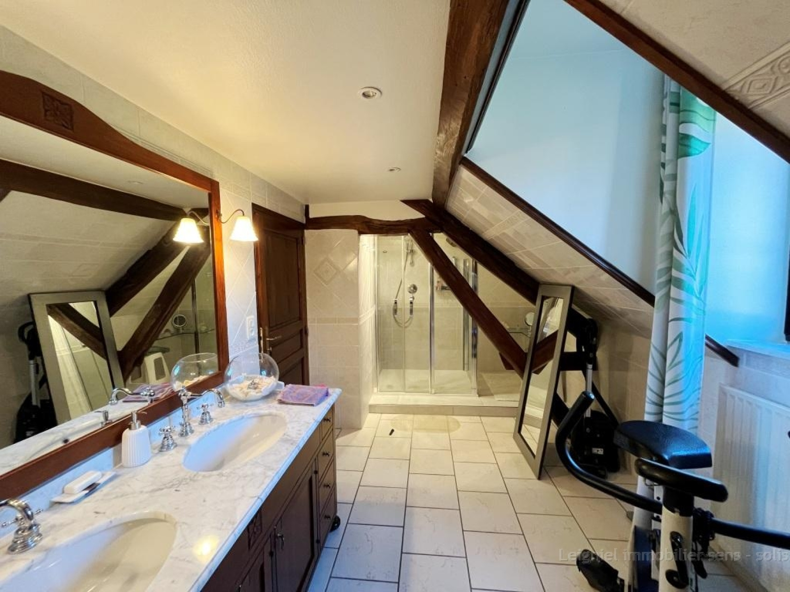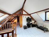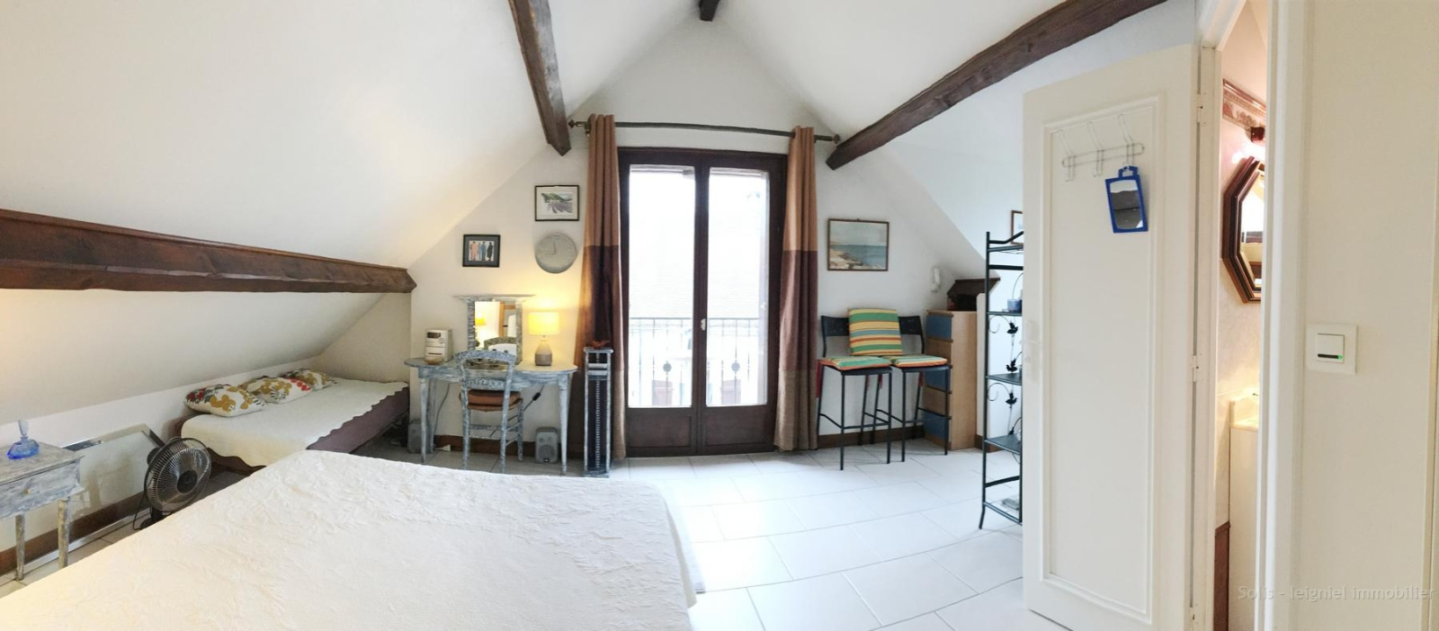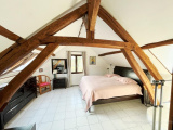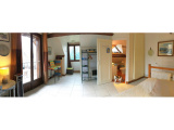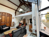 Le deuxième escalier de l'entrée mène à une pièce palière avec coin bureau. Elle dessert une belle salle d'eau avec double vasque et robinetterie rééditée ainsi que trois belles chambres dont une ouvrant sur la mezzanine. A l'extrémité de la maison, grange de 65 mètres carrés, fermée d'une belle double porte vitrée, comprenant chaufferie et buanderie. Autre dépendance avec préau couvert pour 2 voitures et escalier menant à un agréable studio d'amis de 20 m² avec salle d'eau et wc.