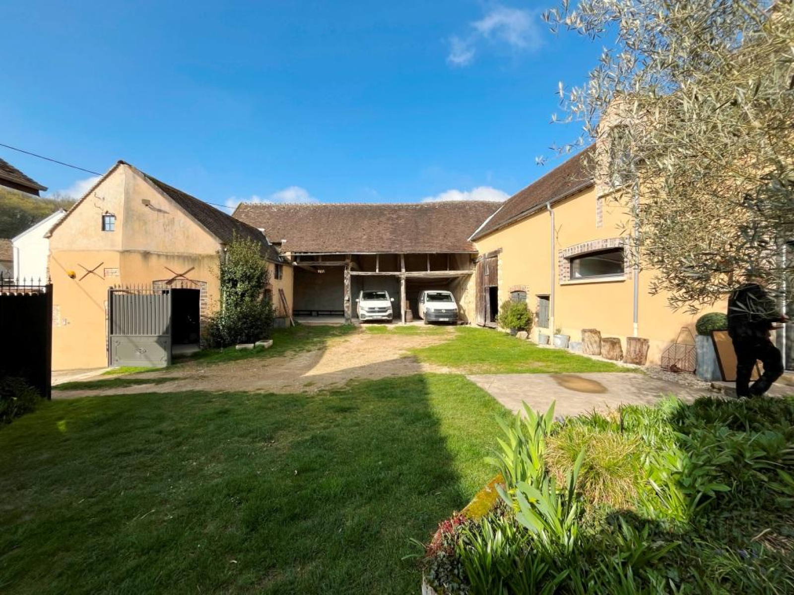 1h30 de Paris, 11mn de Sens et de sa gare, dans un hameau au calme complet : rare propriété remarquablement rénovée de 260 m², ses 5 chambres, ses dépendances, nichée au fond d’un vallon, sur son agréable jardin de 6000 m²et sa piscine à vue dominante sur la vallée.