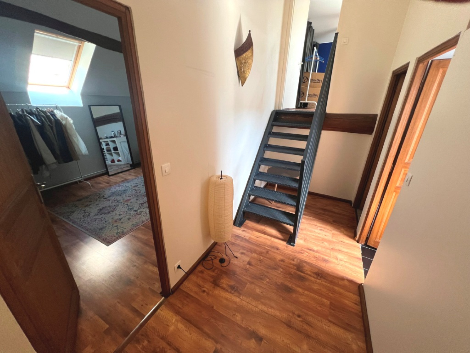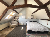 A l'étage, le palier dessert une belle chambre de 20m2 avec tomettes, deux autres chambres dont une chambre avec mezzanine, une salle d'eau, wc.
