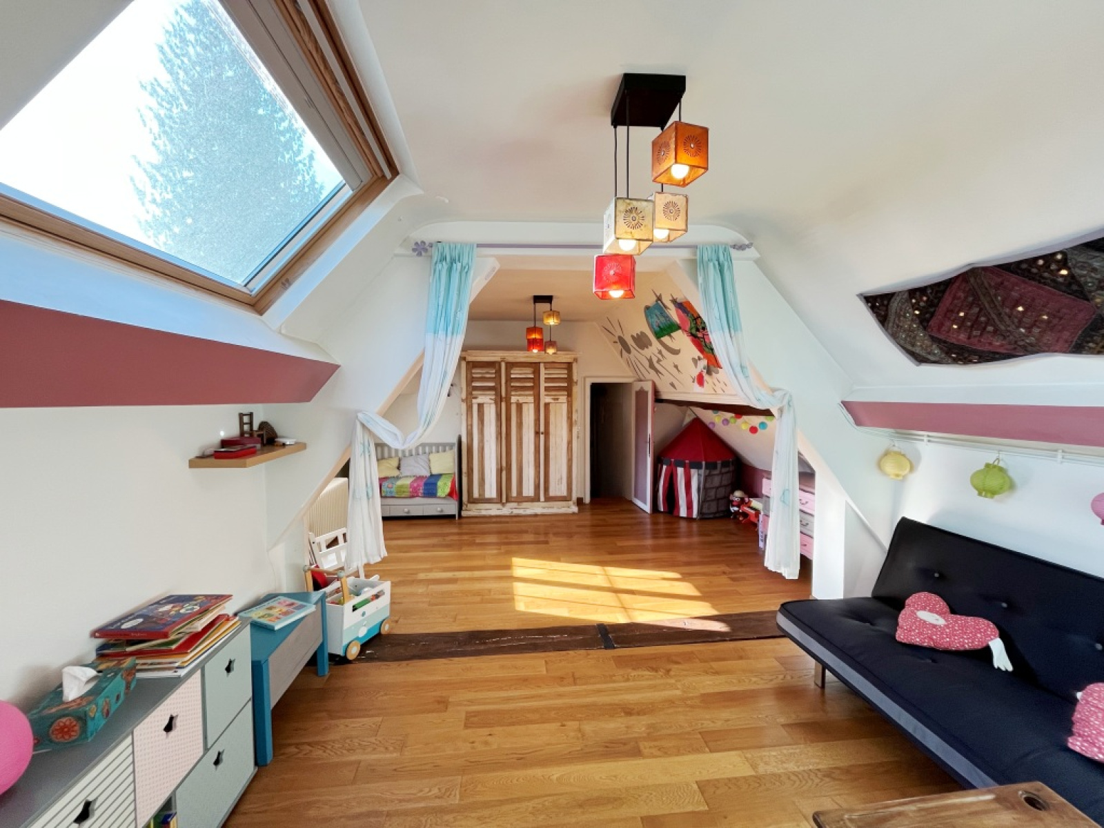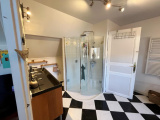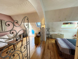 A l'étage palier desservant une chambre avec toile de jouy tendu de style empire, puis une salle d'eau avec wc, un grand dortoir de passage et une suite parentale de30 m² avec chambre, dressing, salle de bain avec douche et accès par porte-fenêtre sur sa terrasse un jaccuzzi et le jardin. (agréable décoration pour les pièces d'eau)