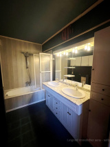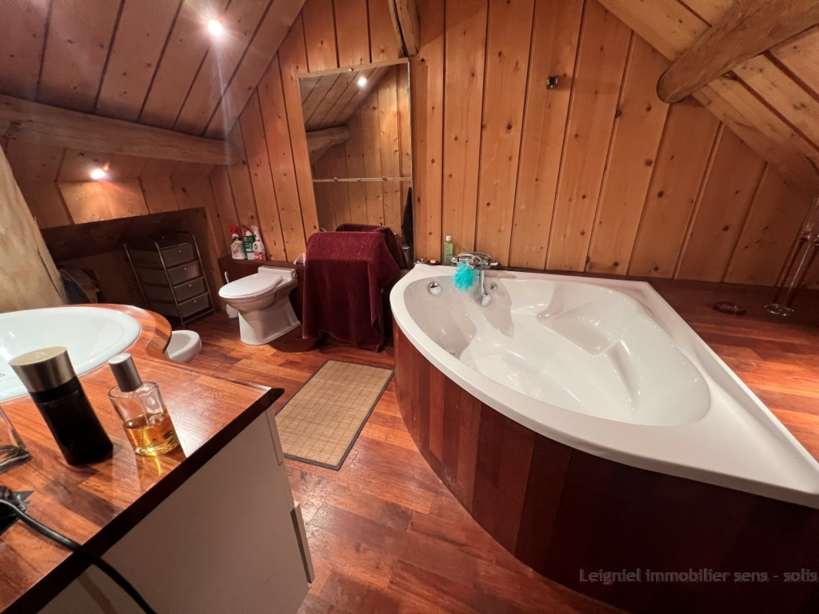 A l’étage, on trouve une chambre avec sa salle de bain avec wc et un espace bureau (ou dressing).